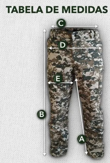 CALÇA: Tecido em Rip Stop profissional militar com 02 Bolsos traseiros com fecho de contato, 02 Bolsos laterais, tipo cargo e 02 Bolsos internos. Fechamento por zíper e botão. Reforço duplo com 5 costuras no "cavalo" também em rip stop e Reforço duplo em "X" nos joelhos. Fecho de contato na barra para melhor ajuste.